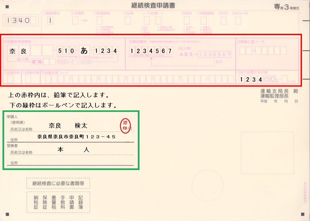この用紙は継続検査を受けるための用紙です。上のピンク色の部分大きくすると判りますが、この部分は鉛筆で記載しなければなりません。