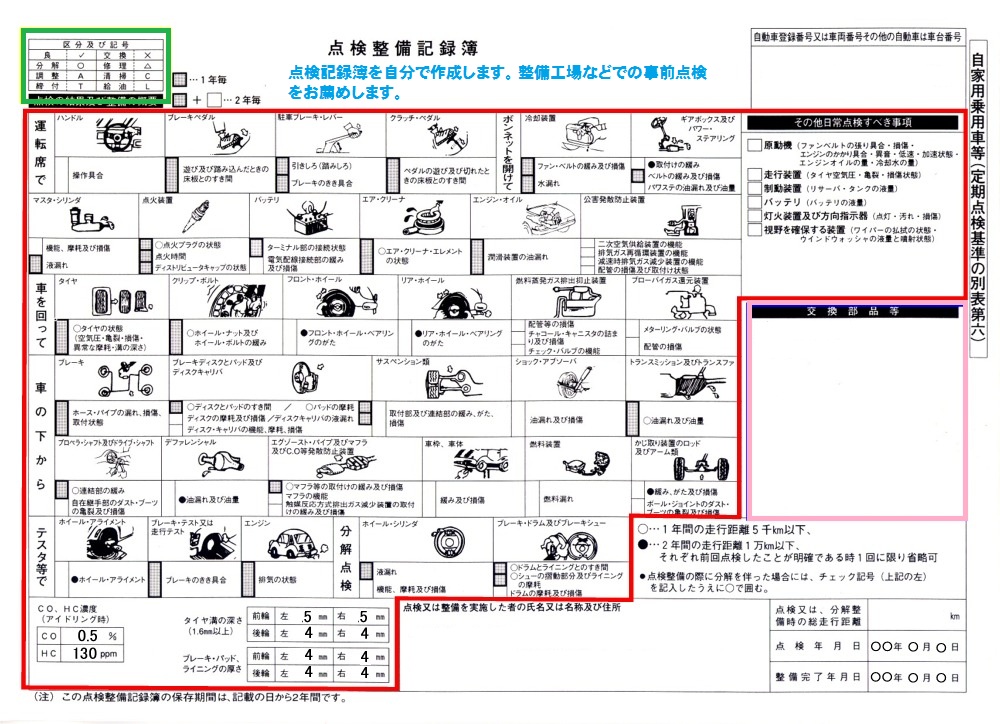 自動車検査証(写真拡大できます)車検証です必ず車に入れていなければなりません。写真のような書類です。車検証は、車のどこかにあります。必ず車に携帯していなければならないものとなっています。 車のダッシュボードに取扱説明書や、メンテナンスノートとかと一緒に入っているのが一般的です。 この後説明の書類を完成させるためにも、車検証がなければ判りません。ここに車検の切れる期日も載っていますのでそれだけでも確認しましょう。 あと、自動車登録番号又は車両番号(ナンバー)、車台番号、車体の形状、原動機の型式、所有者、使用者の住所氏名、備考欄にはエコカー減税の対象車かどうかなどなど 車のすべてが記載されています。 写真をクリックすると大きな画面で見れます。 自動車納税証明書毎年1回車の税金を払ったときの納税証明書です。![]() 毎年1回5月上旬に納付書が送られてきます。金融機関の窓口で払い込むかATMで支払うと窓口で納税証明書に印鑑をついてくれます。 ページー等で支払った場合は、証明書が送付されてきます。 この納税証明書は紛失しやすく、もらったらすぐに車検証などと一緒にしておかないと亡くしてしまします。 でも大丈夫です。毎年期日までに支払っておれば証明書は紛失してても、当日窓口で再発行してもらえます。 点検整備記録簿(写真拡大できます)車の点検を行った時の記録簿です。もちろん自分で作成できます。車の点検整備を行ったときに記録しておくものです。車にはメンテナンスノートというような一冊の冊子として車に備え付けられています。 写真の様式は、一般的な様式ですが、メンテナンスノートで、自分で点検を行い記載したもものが必要になります。 もちろん自分で整備点検するにはそれなりの知識と技術が必要ですが、最近はメンテナンスのやり方のホームページも多くなってきています。 参考にされて点検を行うか、自信が無ければ整備工場で点検を行うこととなります。なおこの整備点検に関しては車検後に行うことも可能です。 車を長持ちさせるためにも必ず点検を行うこととしてください。1〜2回目の車検ならともかく長く使い込んだ愛車なら、車検はパスしても ラジエターの不具合を見逃して、オバーヒートさせたという私の苦い経験から是非点検は行っていただくようお薦めします。 点検を自分で行った場合は、点検者の氏名には自信を持って自分の名前を書きましょう。 自賠責保険(共済)証明書(写真拡大できます)強制保険と呼ばれるもので、車検証と一緒に入っています。この保険は、強制保険ですので必ず車検が満了する日以上の期間で加入されています。これがないと新規の登録も、継続検査もできませんので、 車検証と同じく必ずあるものの一つです。たぶん、車検証入っているケースの裏に入っていることが多いと思います。この証明書は同じような書式で 領収書も一緒にくっついている場合がありますので間違わないようにしてください。 自賠責は、ディラーや整備工場、保険会社など、どこでも加入できますが、当日車検場でも加入することが可能です。 これとは別に任意保険といって、対人対物無制限、車両保険がいくらかとかのCMがされていますが、あれとは別のものですのでこれも 間違わないようにしてください。 自動車重量税納付書(写真拡大できます)車に応じた重量税を当日支払い印紙を貼り付けてもらった書類です。当日準備する用紙です。ここから後の3枚でだいたい100円未満で販売されています。継続検査の用紙をくださいというと 3枚セットで販売してくれます。ここに自動車重量税印紙を買い貼り付けてもらいます。もちろん各車まちまちで、減税の対象車などもありますから その場で車検証だけで判断することは難しいかもしれません。販売している窓口のお姉さんたちも、「この車減税あるかもしれませんからいわれたら、 また来てください」なんて言ってくれます。もちろん多く払い込んでいた場合は、検査終了後に還付してくれますのでご心配なく!(^^)! 継続検査申請書(写真拡大できます)継続検査を受けるための書類です。印鑑が必要です。また、鉛筆で書くところがあります。